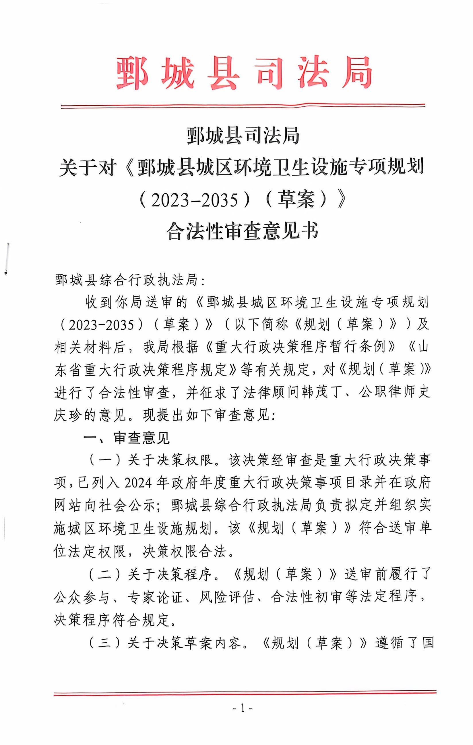 - 標 題:鄄城縣司法局關于《鄄城縣城區環境衛生設施專項規劃(2023-2035年)》合法性審查意見書