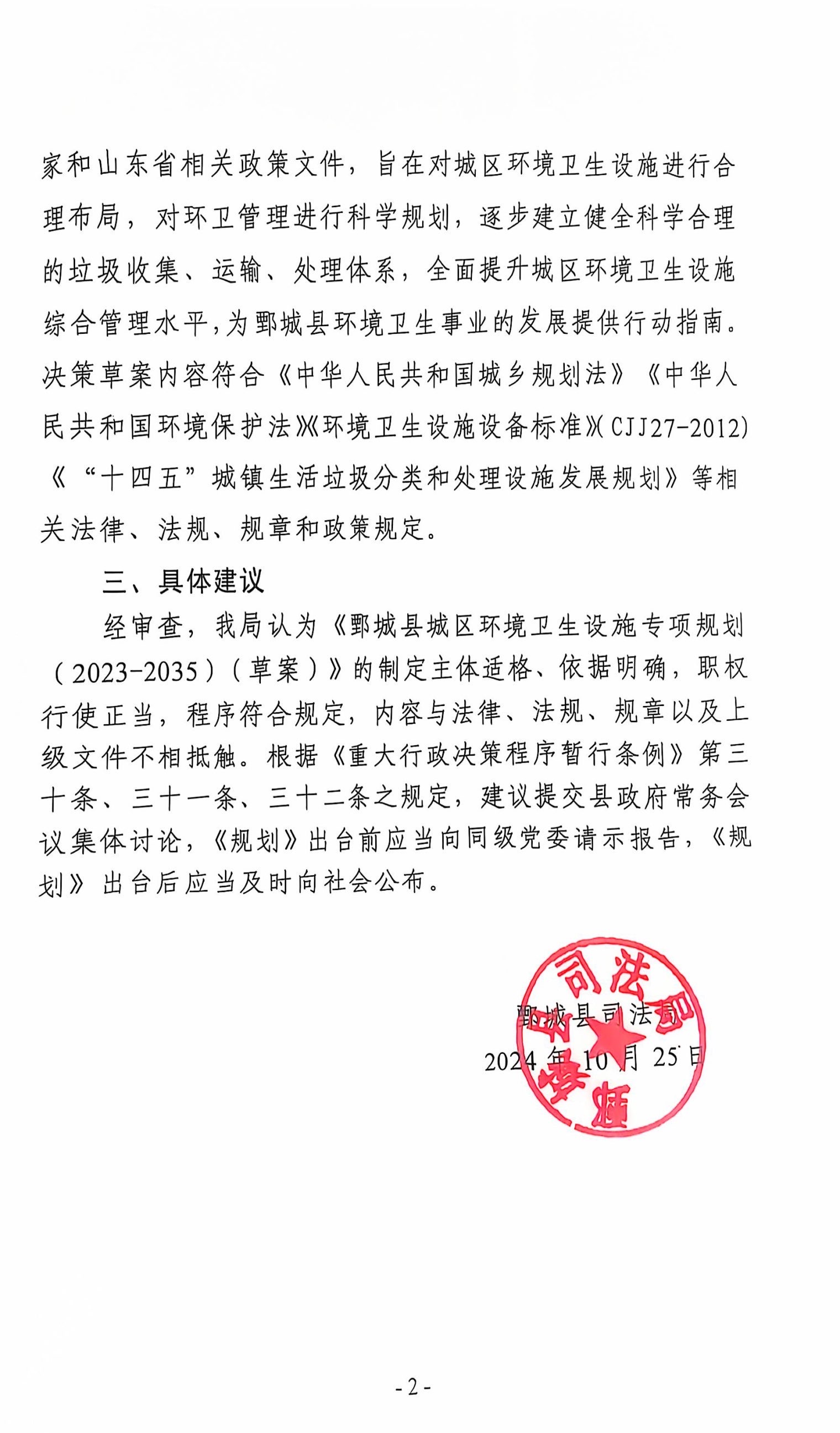 鄄城縣司法局關于《鄄城縣城區環境衛生設施專項規劃(2023-2035年)》合法性審查意見書