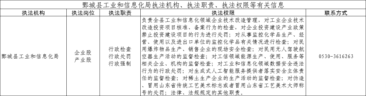 標  題: 鄄城縣工業和信息化局執法機構、執法職責、執法權限等有關信息 發布日期: 2025 年 11 月 20 日